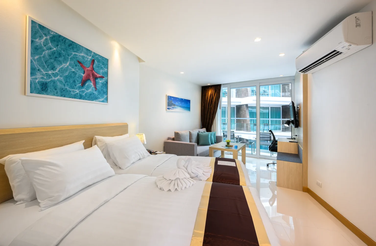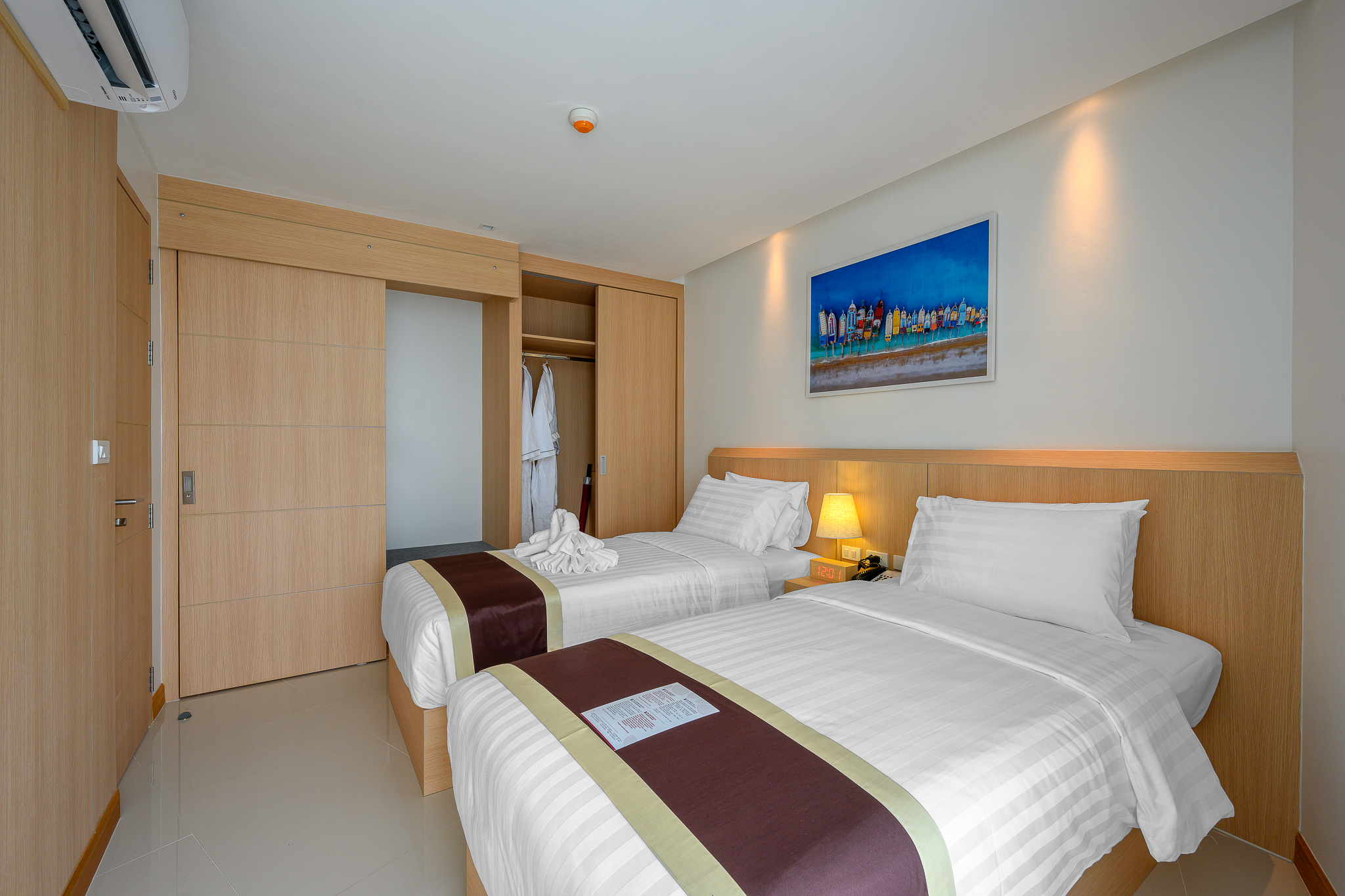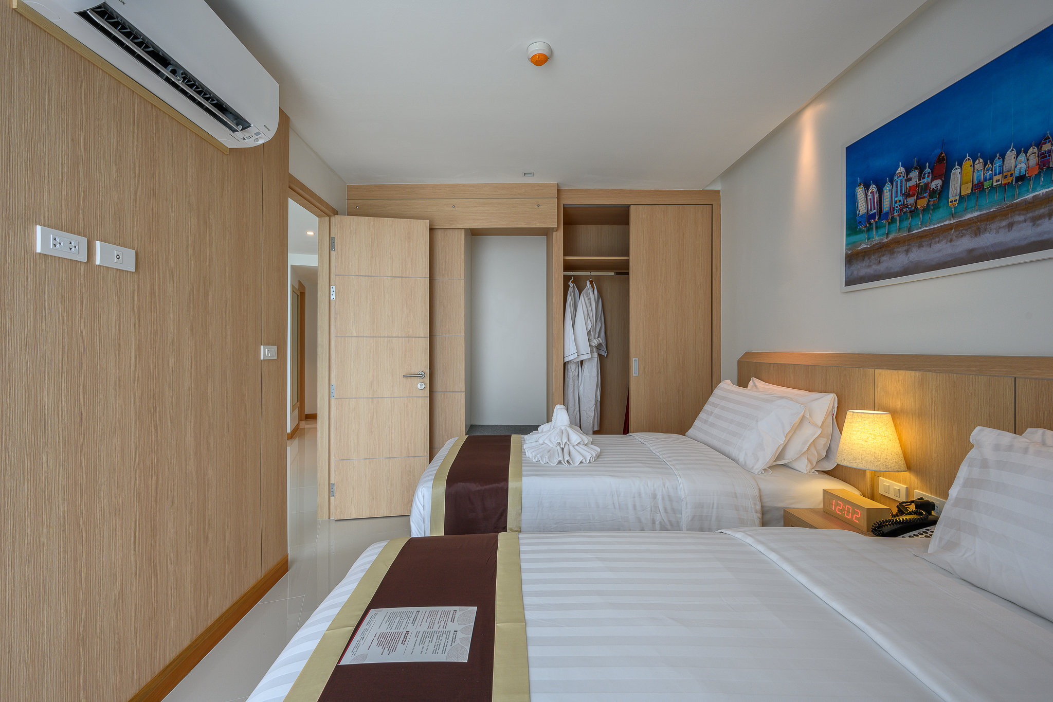 These spacious Suites are in the building closer to the beach and the main facilities offer spectacular vistas over the surrounding bay. One bedroom comes with a double bed and one with twin beds.