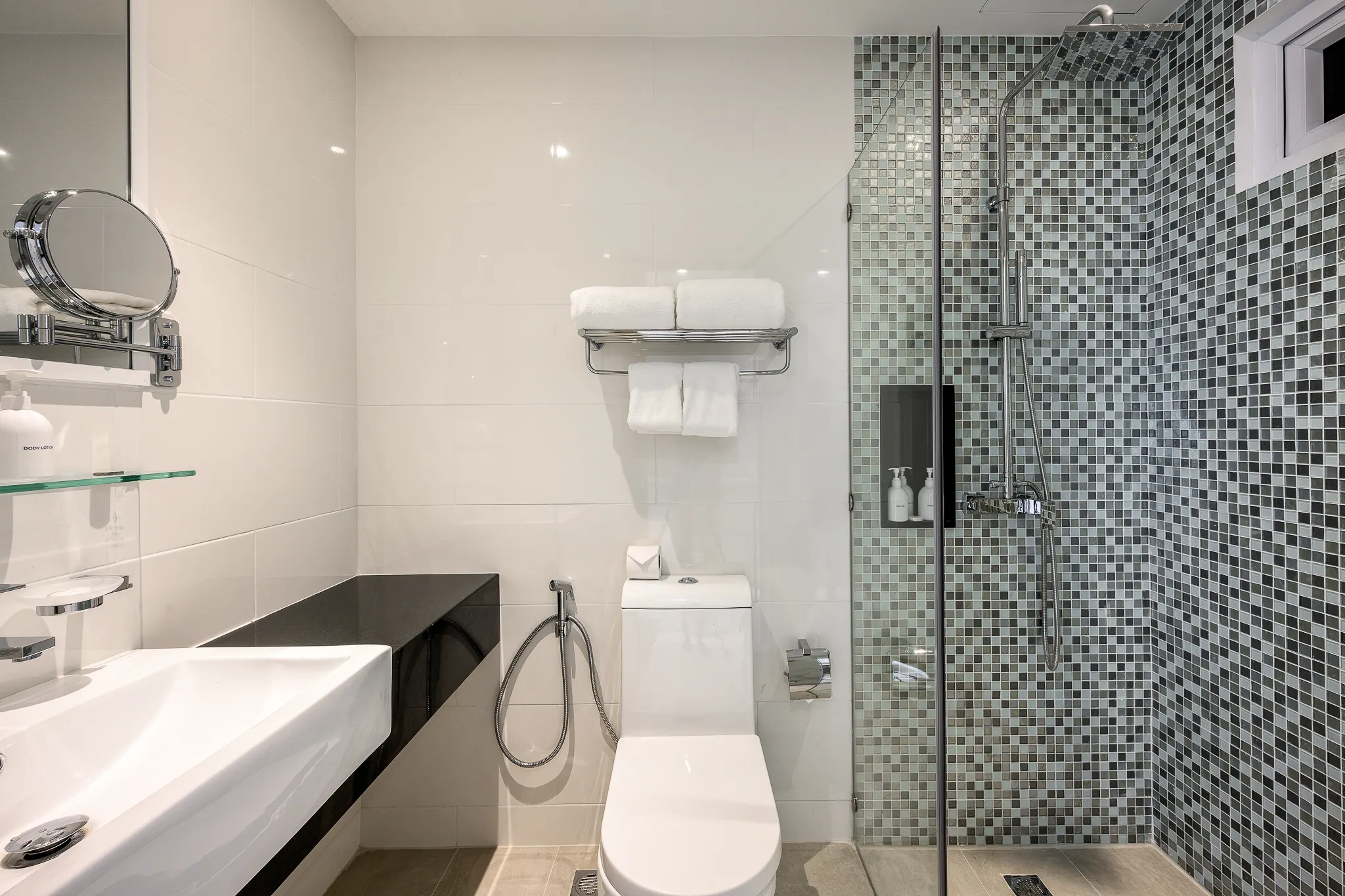 The Deluxe Room with Partial Seaview comes with double or twin beds. The fully equipped kitchenette features a two-door fridge, a stove with an exhaust hood, a sink, and a microwave. Every room offers both indoor and outdoor seating areas with either a terrace or a balcony.