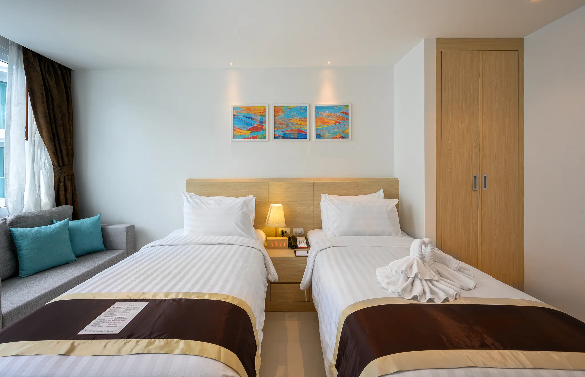 The Standard rooms come with double or twin beds. The fully equipped kitchenette features a two door fridge, a stove with exhaust hood, a sink and a microwave. Every room offers an indoor and outdoor seating area with either a terrace or a balcony.